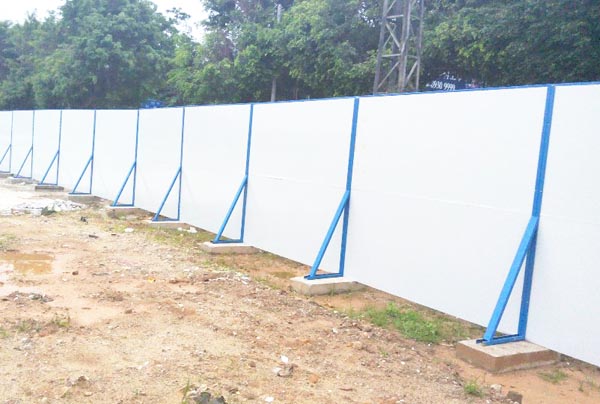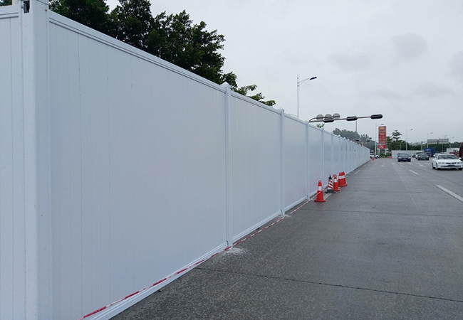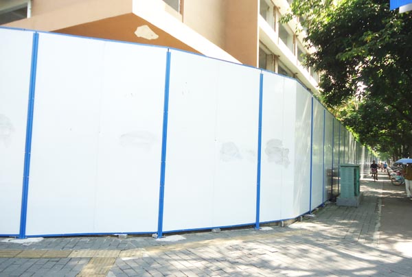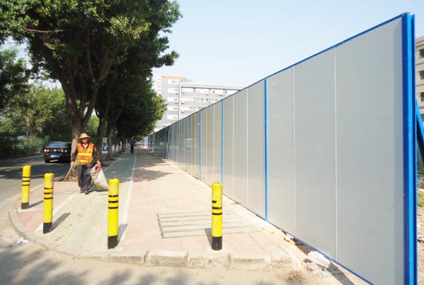 施工圍擋用白色彩鋼板作墻體,用藍(lán)色雙拼C型鋼作立柱,立柱頂部配藍(lán)色造型端蓋(可裝路燈),圍墻四周用藍(lán)色彩鋼框邊。高矮、大小、色澤一致。臟污后隨時可用水清洗擦拭。